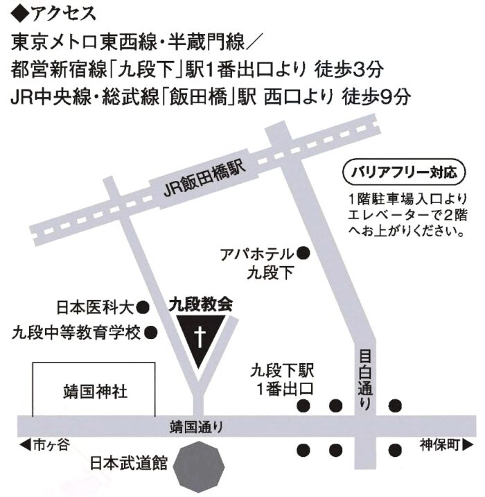 - 東京メトロ東西線/半蔵門線/都営地下鉄 新宿線、九段下駅1番出口より徒歩3分